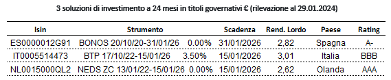 Considerando le attuali condizioni sul mercato dei tassi (al 29.01.2024) e gli strumenti finanziari utilizzati per l’analisi, nell’arco temporale di 24 mesi il differenziale di rendimento tra deposito vincolato e titolo di stato è ancora più marcato a favore del deposito vincolato.