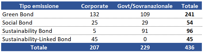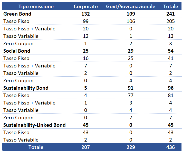 Di seguito sono riportate le obbligazioni ESG quotate sul mercato italiano suddivise per rischio emittente. Possiamo benissimo vedere come il grosso delle emissioni riguardino i green bond (circa il 50% del totale) e che in termini di emittenti, il totale è equamente suddiviso tra obbligazioni societarie (corporate) ed obbligazioni sovrane.
