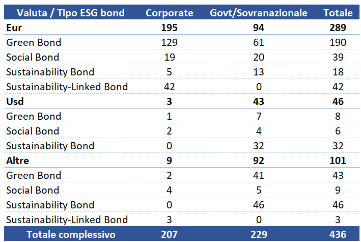 Un altro elemento caratteristico da prendere in considerazione nell’approccio all’investimento in obbligazioni ESG è il rischio valuta. Oltre la metà delle emissioni sono espresse in valuta locale (Eur) tale per cui un investitore dell’area Euro non sopporterebbe il rischio di deprezzamento valutario del proprio impiego. Per quanto riguarda la valuta Us dollar, la maggior parte delle emissioni sono di tipologia “sustainability“: come detto in precedenza, i proventi del prestito obbligazionario saranno utilizzati congiuntamente a cura di progetti ambientali e sociali ad impatto positivo; in questo caso, tuttavia, c’è il rischio che la valuta USD possa deprezzarsi contro l’Euro (così come rivalutarsi).