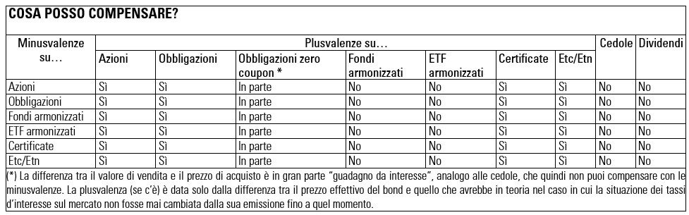 Come leggere la tabella? Come primo passo cerca la riga corrispondente al prodotto che hai venduto in perdita. Se per esempio hai venduto dei bond in perdita, posizionati sulla seconda riga. Scorri ora le varie caselle della riga: dove trovi “sì”, vuol dire che puoi vendere il prodotto indicato in quella colonna in guadagno e sfruttare le minusvalenze che hai accumulato. Se trovi “no”, vuol dire che se vendi il prodotto indicato in quella colonna pagherai comunque le tasse, anche se hai minusvalenze pregresse