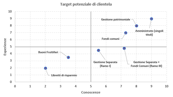 Il grafico seguente raggruppa i prodotti appena descritti sulla base del grado medio di esperienza e conoscenza degli strumenti finanziari del risparmiatore. Ai BFP e ai LdR corrispondono investitori con un basso livello di conoscenza/esperienza, mentre ai fondi comuni, alle gestioni patrimoniali e all’amministrato competono investitori più eruditi in tema di finanza.