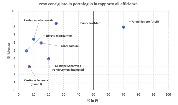 Attualmente c’è minore efficienza, e quindi minor peso consigliato, per i prodotti a risparmio assicurativo. Il grado inferiore di efficienza in questo caso deriva dal modesto rendimento annuo ottenibile una volta scorporati i vari costi gravanti.