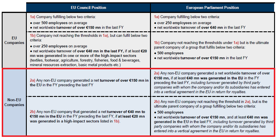 Allo stesso modo viene riportata una tabella sintetica delle posizioni del Parlamento Europeo e del Consiglio Europeo in merito alla portata della direttiva sulle pratiche di Due Diligence sui temi di sostenibilità.