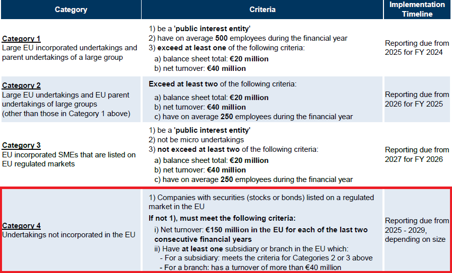 Di seguito viene illustrato l'ambito di applicazione della CSRD, evidenziando in rosso i requisiti per le imprese non europee.