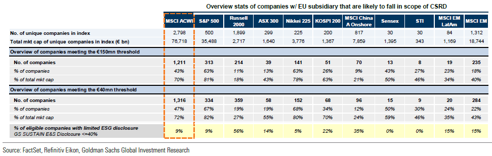 Uno studio effettuato da Goldman Sachs ha evidenziato la portata degli adempimenti di CSRD e CSDDD sulle aziende non europee quotate e costituenti alcuni indici azionari internazionali.