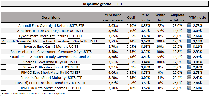 Nel seguito una tabella che sintetizza le opportunità di rendimento offerte dagli strumenti che replicano tassi monetari o con sottostante obbligazioni a breve vita residua. Si tratta di ETF quotati sulla borsa di Milano, per i quali viene riportata la voce di costo ricorrente annuo, la percentuale di titoli sovrani EMU all'interno del portafoglio dell'ETF (white list) con la conseguente tassazione.