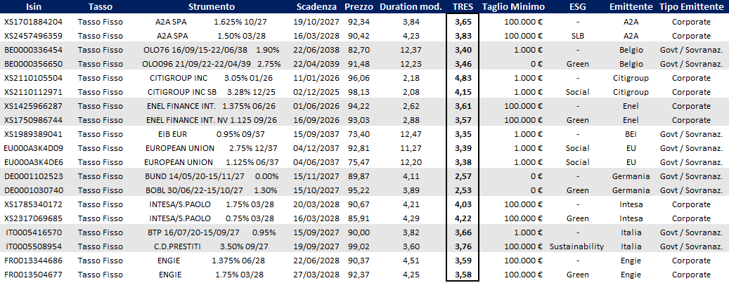 Analizzando la colonna del TRES (Tasso di Rendimento Effettivo a Scadenza, ossia il rendimento annuo) possiamo notare alcune risultanze: accettando errori statistici dovuti a scadenze difformi per le obbligazioni prese in esame, non si notano tassi di rendimento significativamente differenti tra obbligazioni ESG e obbligazioni non ESG.